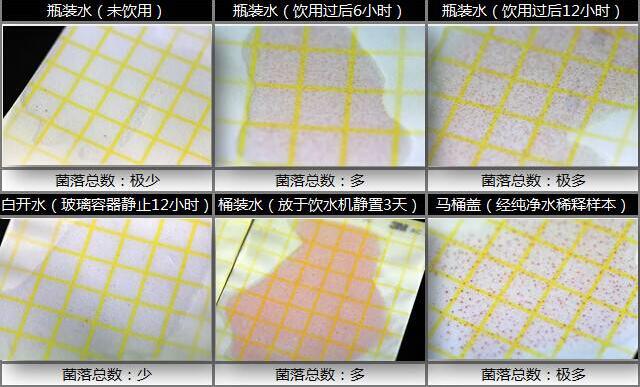 本次測試我們選擇了貼近實際消費者飲水習慣的幾種常見水源,它們分別為瓶裝水(剛剛開啟)、瓶裝水(開啟飲用后6小時)、瓶裝水(開啟飲用后12小時)、白開水(放置12小時)、常見桶裝水(飲水機上放置3天)。而除了以上水樣外,我們還搬出了重口味嘉賓:馬桶。